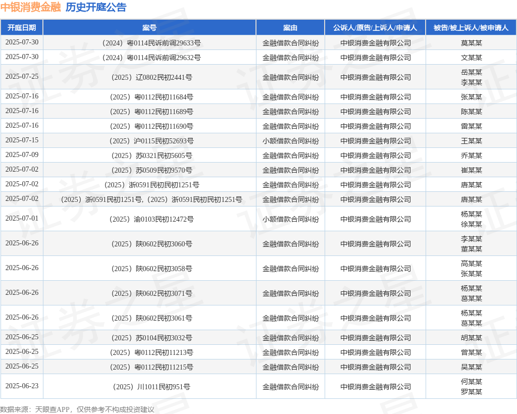 案号:(2025)浙0703民特355号审理法院:金华市金东区人民法院案由:申请实现担保物权当事人信息: 原告/上诉人:中银消费金融有限公司 被告/被上诉人:卢某某、郑某某开庭日期:2025年5月14日根据统计,近一年内以中银消费金融有限公司为当事人的历史开庭公告有11951则,其中案由为“金融借款合同纠纷”的公告以9316则居首,其次为“借款合同纠纷”有1407则,“小额借款合同纠纷”有1075则。历史开庭公告(前20条)如下: