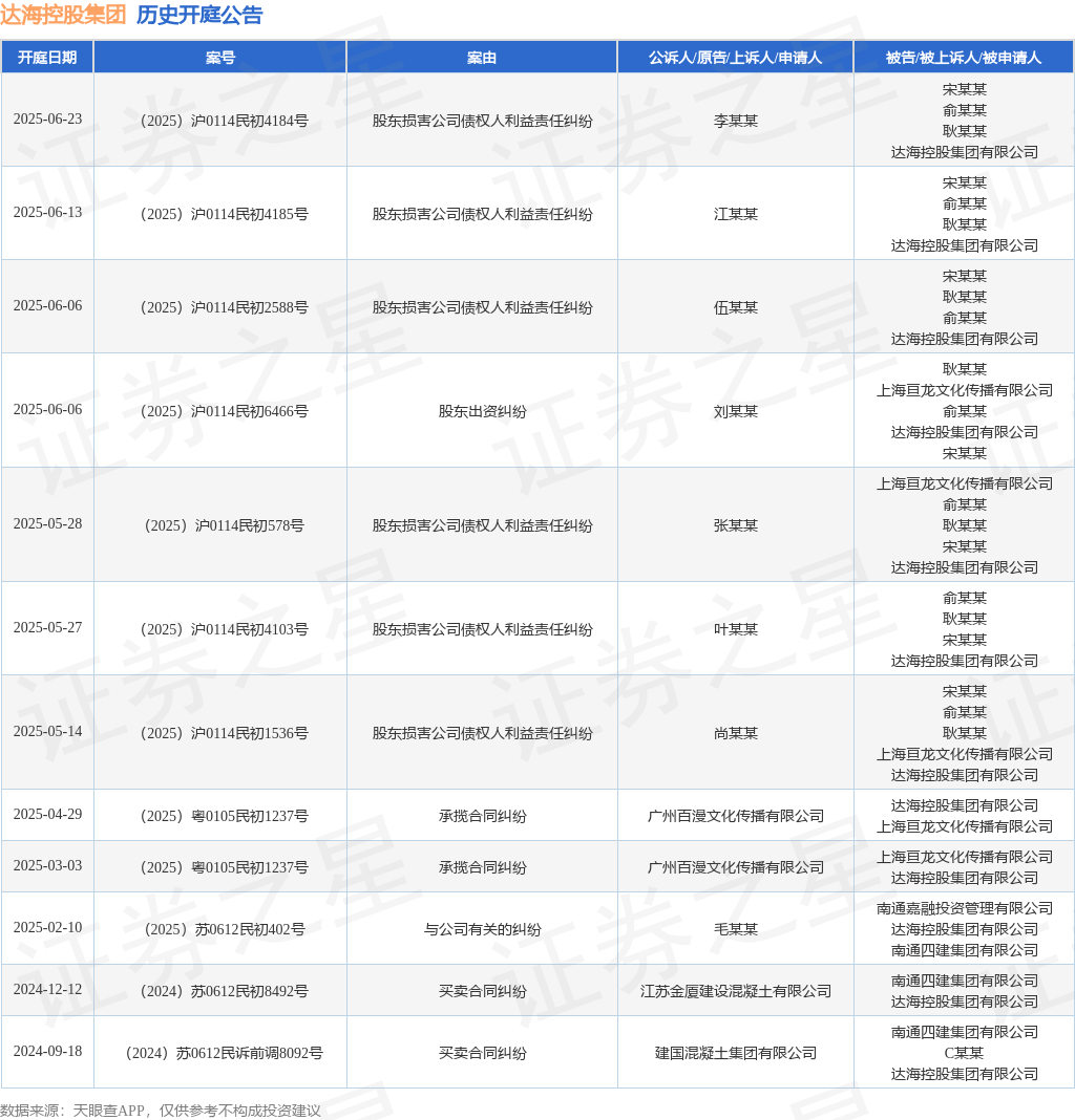 案号:(2025)沪0114民初1536号审理法院:上海市嘉定区人民法院案由:股东损害公司债权人利益责任纠纷当事人信息: 原告/上诉人:尚某某 被告/被上诉人:宋某某、俞某某、耿某某、上海亘龙文化传播有限公司、达海控股集团有限公司开庭日期:2025年5月14日根据统计,近一年内以达海控股集团有限公司为当事人的历史开庭公告有12则,其中案由为“股东损害公司债权人利益责任纠纷”的公告以6则居首,其次为“买卖合同纠纷”有2则,“承揽合同纠纷”有2则。历史开庭公告如下: